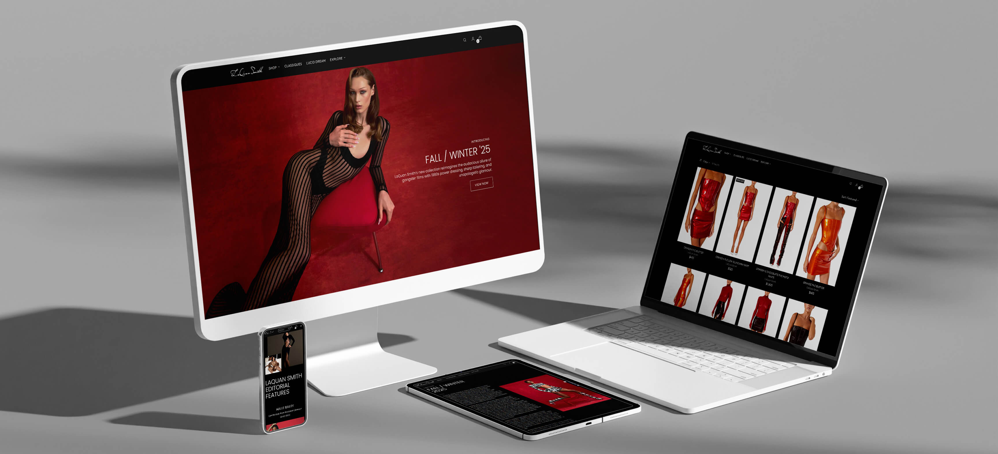 In close creative collaboration with the LaQuan Smith team, the digital experience was meticulously crafted to align with the brand’s bold aesthetic, seasonal storytelling, and fashion-forward identity. Every design decision was guided by the brand’s DNA, ensuring authenticity across the experience. This was paired with a performance-driven approach that balanced striking, high-impact visuals with mobile optimization, delivering a seamless user experience without compromising speed or functionality.