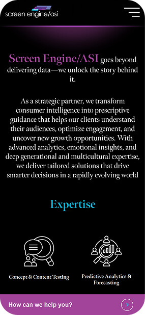 Our collaboration helped Screen Engine/ASI articulate its strategic, analytical, and human strengths on a global scale through the development of a modern, authoritative brand identity that balances rigor, creativity, and personality. We built a scalable digital ecosystem that supports enhanced website functionality, CRM integration, and global client engagement, while also elevating employee visibility and reinforcing the value of the people behind the insights. These efforts enhanced brand activation and shifted client perception, positioning Screen Engine/ASI as a trusted, internationally recognized strategic partner in entertainment and media analytics.